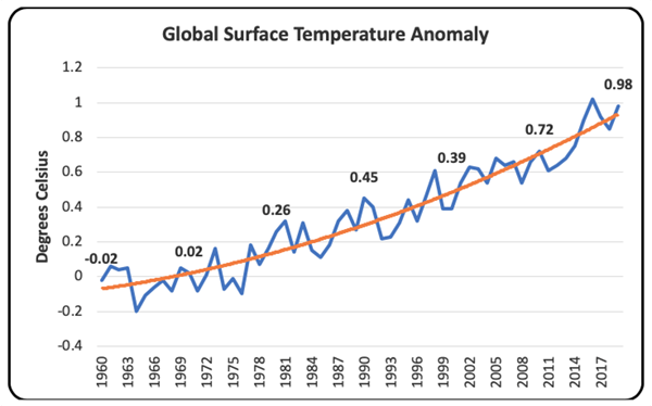 Response: There is no evidence that the world is cooling. On the contrary, as the following graph shows, the global surface temperature of the Earth is steadily rising. And this doesn’t include the world’s oceans which absorb 93% of all the heat from anthropogenic global warming.